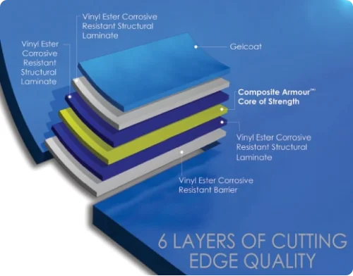 En glasfiberpool har olika många skikt och det brukar variera från mellan fyra till nio stycken lager. Beroende på hur många lager poolen har så är poolväggarna någonstans mellan fem till åtta millimeter i tjocklek och de olika skikten består oftast av polyester och vinylester.