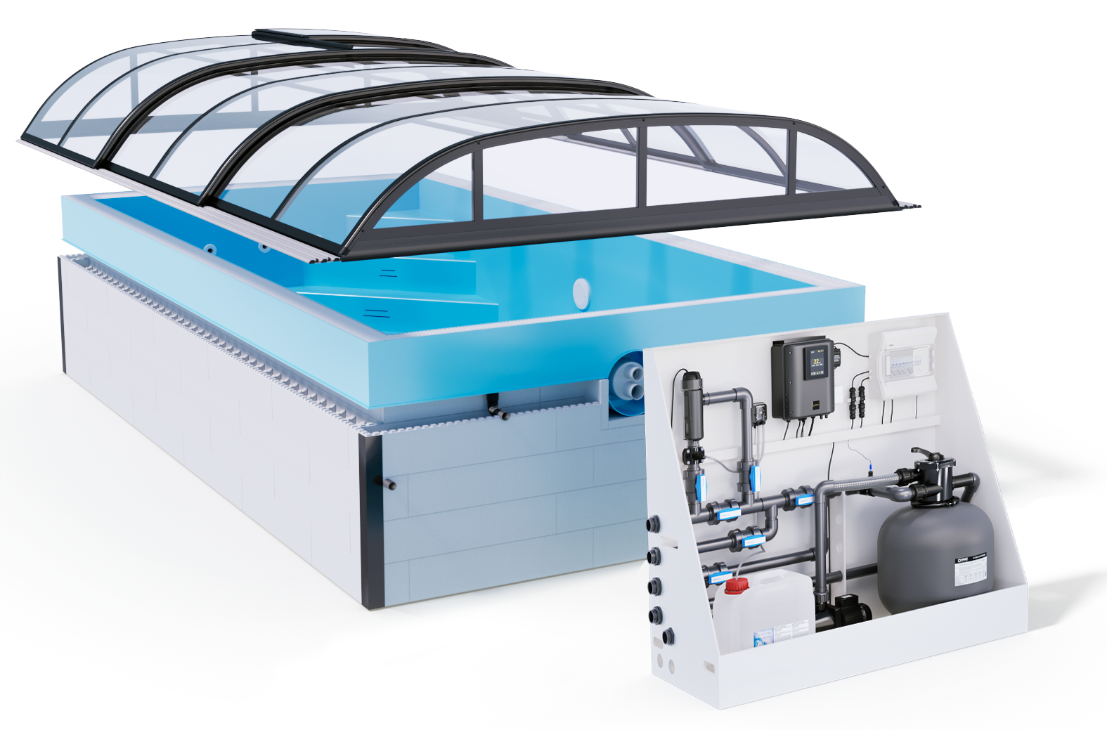 Minipool Wellness pool  är en poolkonstruktion som kombinerar fördelarna med thermopoolens konstruktion och PP Poolens exklusiva material att tåla höga vattentemperaturer utan förkortning av livslängden.