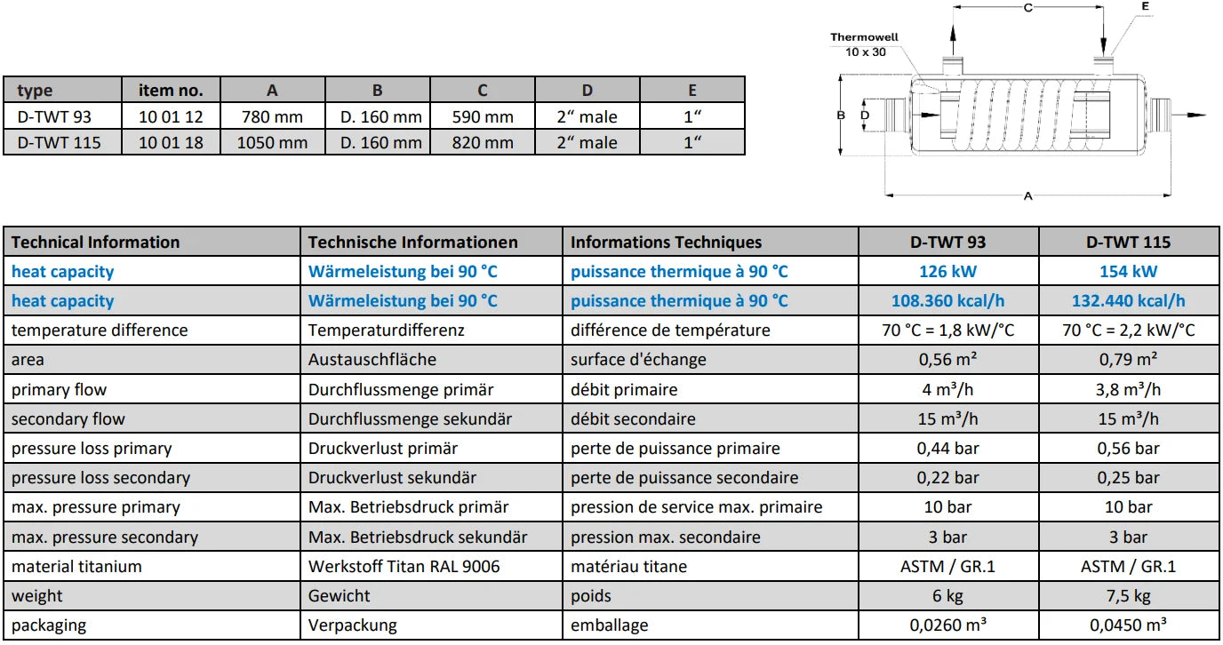 Vatten/vatten värmeväxlare, behandlas med den vanliga premien utförande och omsorg, toppmoderna svetsning. Denna premium värmeväxlare har kompromisslöst motstånd mot korrosion, även vid höga saltnivåer i poolvatten, och är därför havsvatten bevis. Dessa värmeväxlare erbjuder maximal energieffektivitet till minimal tryckförlust. Som all lindad slangvärme växlare måste de integreras i badvattenkretsen antingen direkt eller genom bypass-systemet.