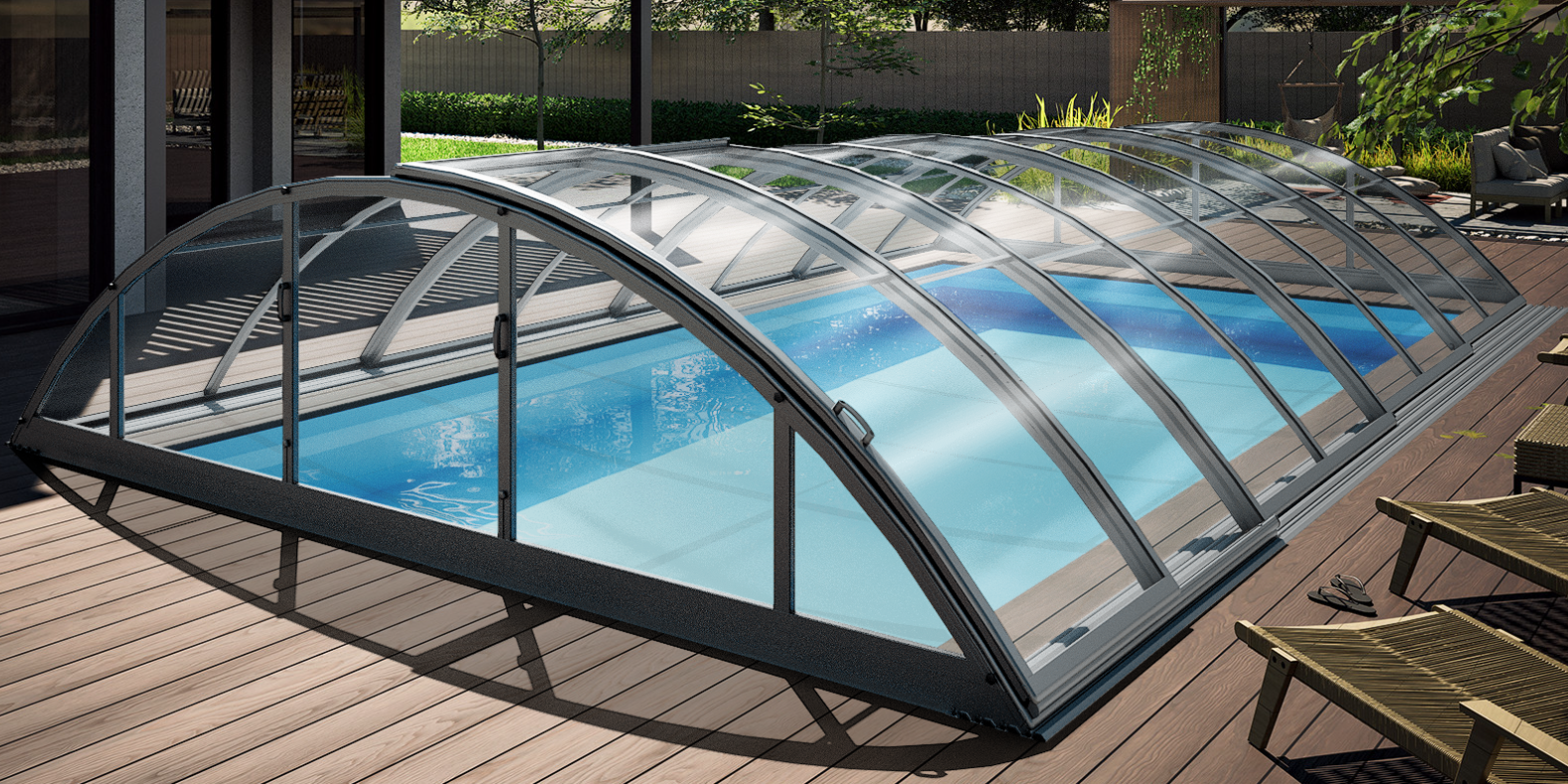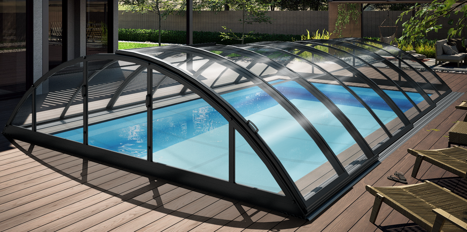 Detta låga pooltak kombinerar en tilltalande estetik med hög funktionalitet. Konstruktionen består av klarglas polykarbonatpaneler som möter elegant antracit pulverlackerade aluminiumprofiler. En betydande fördel med detta...