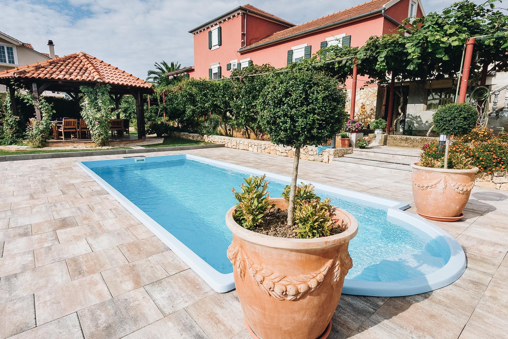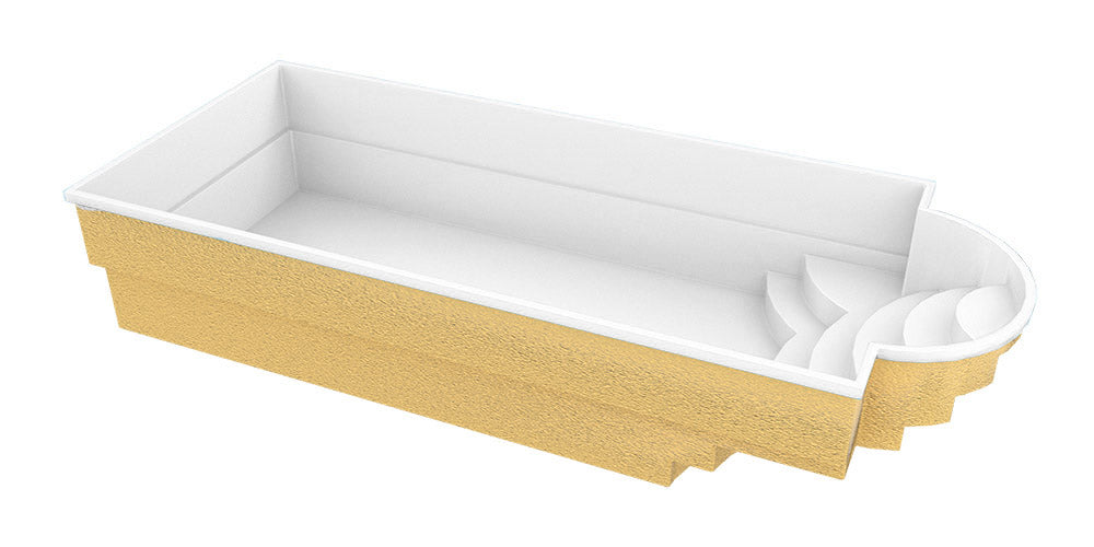Pool med en längd på 8m bredd 3,20m och ett djup på 1,52m i förstärkt polyester. En vacker poolmodell med avrundad romersk trappa som också fungerar som sittplats. Med en exotisk träbräda runtomkring kommer att se sofistikerat ut i trädgården.