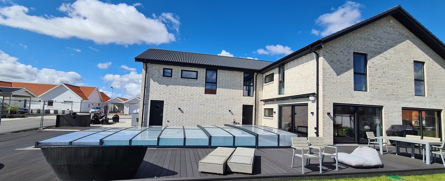 Ett lågt pooltak med klarglas polykarbonat och antracit pulverlackerade aluminiumprofiler.